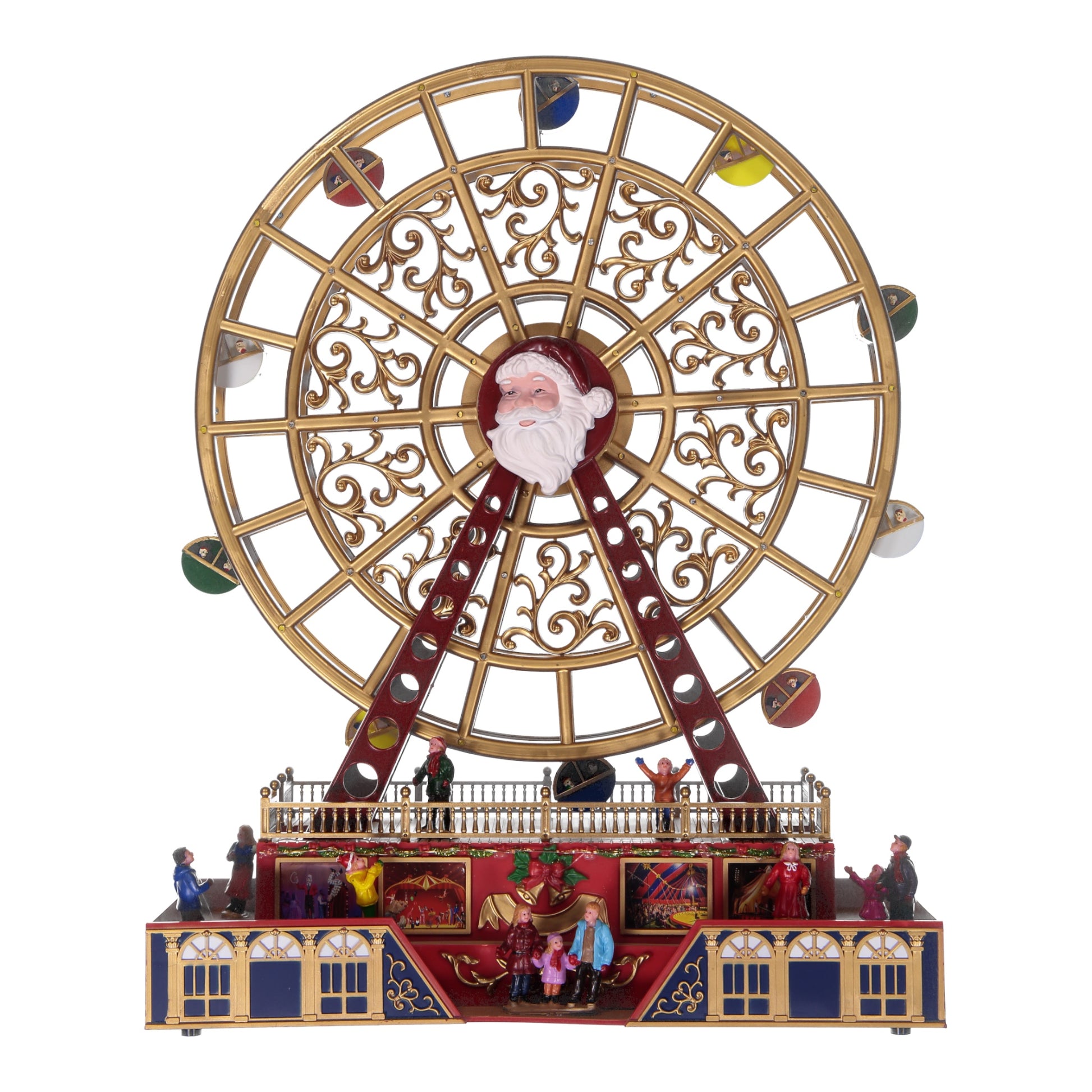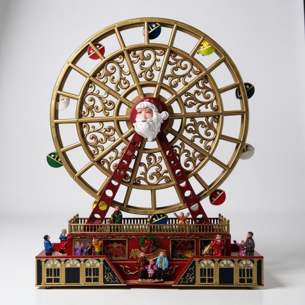 Create a magical holiday atmosphere with this Santa Ferris Wheel Animated Christmas Decoration. Featuring a beautifully detailed gold Ferris wheel with colourful gondolas, intricate scroll patterns, and a cheerful Santa at its heart, this piece brings festive fun to life.